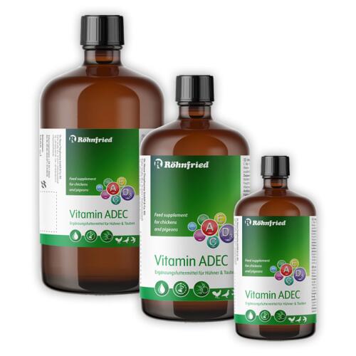 Röhnfried Vitamin ADEC dient zur zusätzlichen Vitaminversorgung mit den Vitaminen ADEC für Hühner und Tauben. Es fördert Wachstum, Legeleistung und erhöht die Schlupfraten. Wenn Tiere außergewöhnlichen Belastungen (Stressfaktoren) ausgesetzt sind, ist eine zusätzliche Gabe Vitamin ADEC sehr empfehlenswert und somit eine ideale Ergänzung!